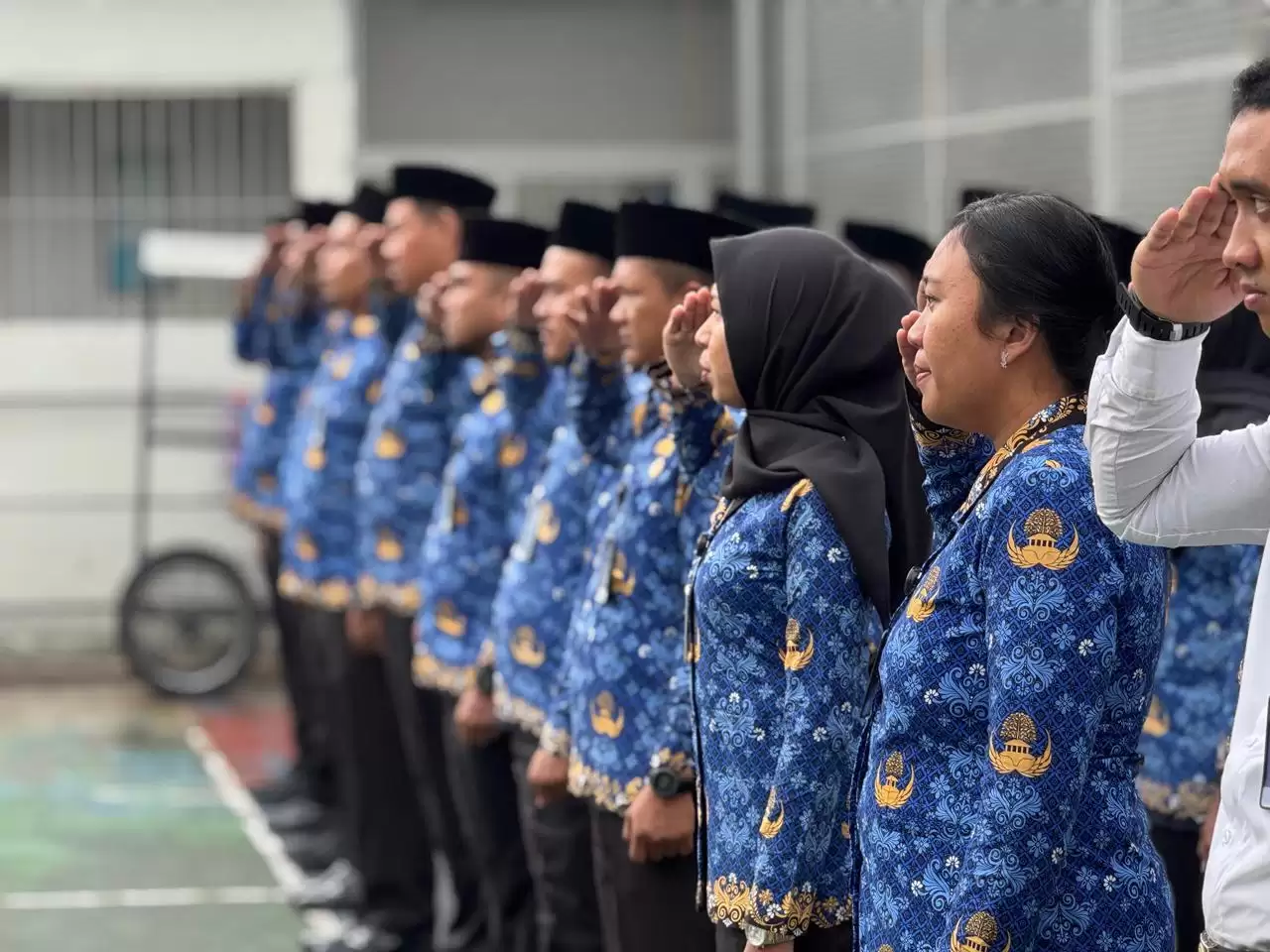 Seluruh pejabat struktural dan pegawai mengikuti kegiatan dengan mengenakan seragam batik Korpri sebagai bentuk penghormatan dan semangat nasionalisme.