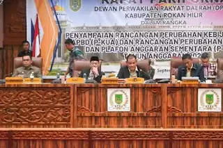 Mediapesisirnews.com, ROHIL | Bupati Rokan Hilir Afrizal Sintong menyampaikan rancangan perubahan Kebijakan Umum Anggaran (KUA) dan rancangan perubahan Prioritas Plafon Anggaran Sementara (PPAS) tahun anggaran 2024 pada Rapat Paripurna Dewan Perwakilan Rakyat Daerah (DPRD) Rokan Hilir, Kamis (12/9/2024) malam di Aula Sidang Utama Kantor DPRD Rohil, Jalan Lintas Pesisir Batu Enam, Bagansiapiapi, Rohil, Provinsi Riau.