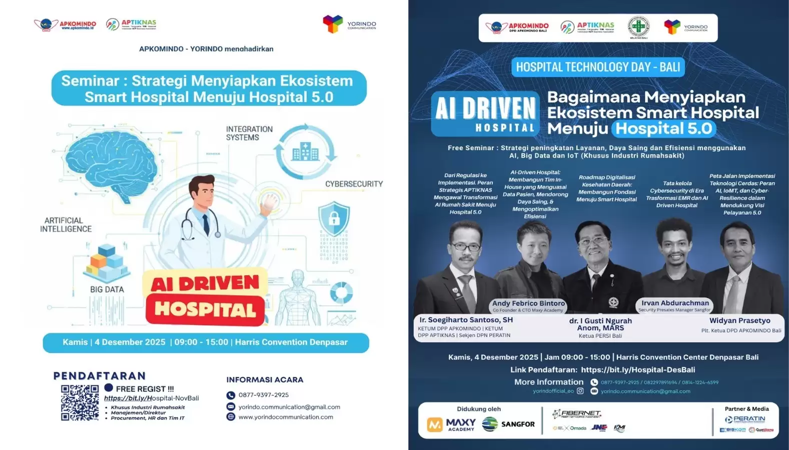 MEDIAPESISIRNEWS.com, BALI - Setelah sukses menggelar Hospital Technology Day 2025 di Jakarta yang mendapat apresiasi luas dari industri kesehatan dan teknologi, inisiatif strategis untuk mempercepat transformasi digital kesehatan kini berlanjut ke Pulau Dewata. Yorindo Communication, bekerja sama dengan DPD APKOMINDO Bali dan APTIKNAS, sukses menyelenggarakan roadshow bertajuk “AI Driven Hospital: Menuju Hospital 5.0 yang Aman dan Efisien”.